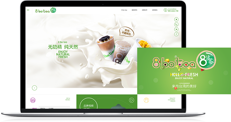 八波茶【8波茶】茶飲品牌以手工制作珍珠為特色,著力打造一個屬于家門口“星巴克”茶飲品牌。邁若網絡為8botea量身定制符合其品牌健康、活潑、自然屬性的品牌網站。