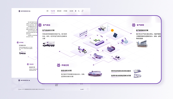 網(wǎng)站圍繞VI視覺體系,整體色調(diào)統(tǒng)一,簡約大氣,突出整體專業(yè)性。網(wǎng)頁運用icon+動態(tài)效果展示,加入手繪2.5D產(chǎn)品圖案,,細節(jié)突出了氫楓中國的可持續(xù)綠色能源理念形象。