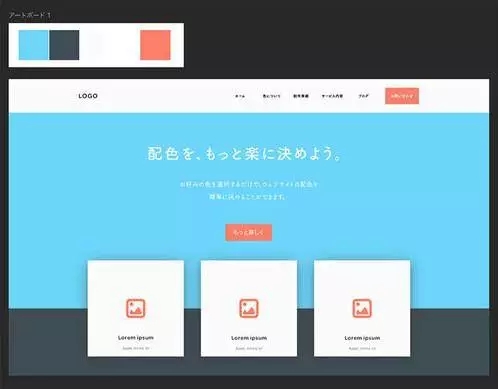 Paletton基色在前面已經決定好了,「淡藍色(#57CBEC)」輸入到左下角的BaseRGB中、下面的設計案例用來參考,讓我們來點擊「AddComplementary(追加上輔色)」按鈕。另外、通過點擊左上角的圖標,有大量的可供你決定的配色方案。在這一次,我們的強調色、就選擇顯眼的紅色(#FF6F59)吧。
