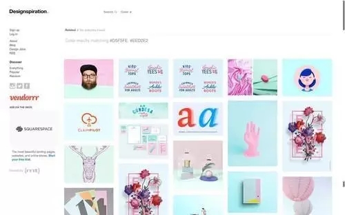 在Designspiration這可以選擇五種顏色相互組合、在形象更相符的作品中選擇合適的配色作為參考。舉個例子,在這里選擇淡藍色和粉紅色。